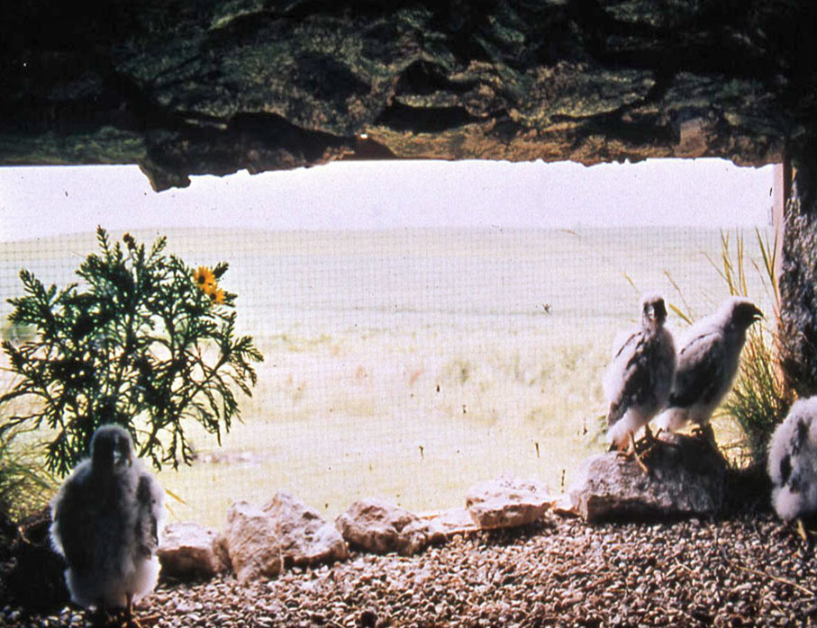 Bob and several friends and Project members, including John Dingley and Dave Kester, built a special eyrie on the side of his house in which to raise the captively-bred falcons for release. The eyrie was built to resemble a cave and looked out on a natural landscape. The young falcons were raised in this chamber with as a little human interaction as possible until they were ready for release.